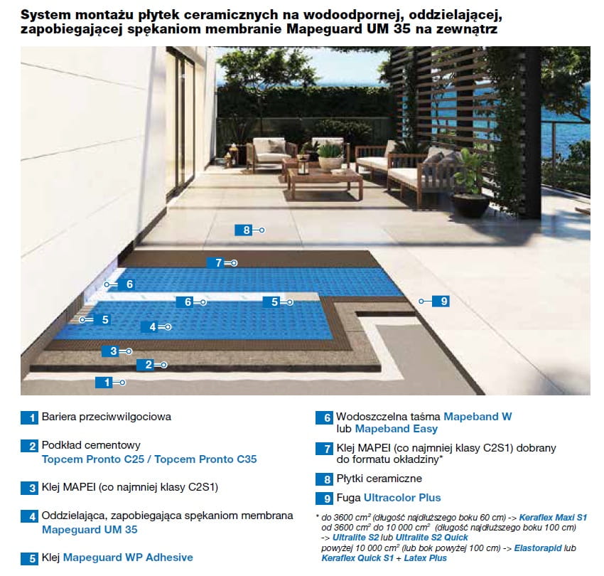 Mapeguard UM 35 to membrana składająca się z warstwy wykonanej z polietylenu o dużej gęstości (HDPE), o strukturze plastra miodu i chropowatej powierzchni oraz ze spodniej warstwy wykonanej z tkaniny polipropylenowej. Taka budowa membrany poprawia przyczepność kleju po obu stronach Mapeguard UM 35.