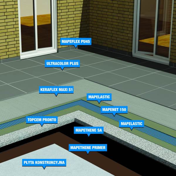 Wykonywanie powłok wodochronnych na podłożach cementowych, uszczelnianie łazienek, natrysków, balkonów, tarasów, basenów pływackich itp. przed układaniem płytek ceramicznych. Mapelastic może być nakładany na podkłady i tynki cementowe, na istniejące podłogi pokryte płytkami ceramicznymi, kamieniem naturalnym, lastryko itp. - pod warunkiem, że są czyste i mocno związane z podłożem. Grubość pojedynczej warstwy nie powinna przekraczać 2 mm, natomiast grubość dwóch warstw izolacji powinna wynosić min. 2 mm. W przypadku nanoszenia zaprawy na powierzchnie poziome, na podłoża szczególnie narażone na obciążenia lub popękane, zaleca się zatopienie w drugiej warstwie zaprawy siatki Mapenet 150 (4x4,5 mm). W celu zwiększenia wytrzymałości warstwy izolacyjnej i zdolności mostkowania (crack bridging) zaleca się zatopienie, przed naniesieniem drugiej warstwy, włókniny polipropylenowej Mapetex Sel. Zaprawę należy nanosić na wilgotne, ale nie mokre podłoże. Ułożona warstwa hydroizolacji Mapelastic powinna być zabezpieczona przed opadami deszczu przez pierwsze 24 godziny po wykonaniu. Okładzinę ceramiczną można układać min. po 4-5 dniach od wykonania izolacji. Powłoka wykonana z Mapelastic zabezpiecza powierzchnię przed wodą, zachowując jednocześnie paroprzepuszczalność. Posiada zdolność pokrywania mikropęknięć w podłożu nawet do 2,5 mm (przy zastosowaniu Mapetex Sel). Mapelastic odpowiada wymogom normy PN-EN 1504-2, w zakresie zasad ochrony powierzchni betonowych PI, MC i IR. Produkt jest również zgodny z wymogami normy PN-EN 14891.