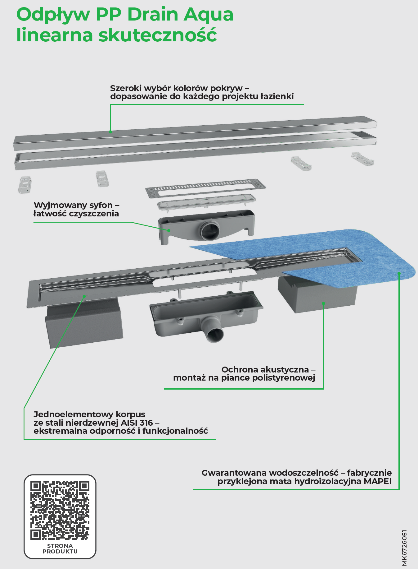 PP Drain Aqua są dostępne w wykonaniu z poziomym syfonem odpływowym DN40 (przepływ 50 l/min), z bezpośrednim odpływem pionowym DN50 lub syfonem obracanym o 360° DN40 (przepływ 30 l/min). Odpływy wyposażone w syfon mają wysokość 70 mm, a wersje z syfonem obracanym o 360 65 mm do poziomu gotowej podłogi, w obu przypadkach długość widocznej pokrywy wynosi od 60 do 120 cm. Korpus odpływu wyposażony jest w trwale przyklejoną wodoodporną membranę (zgodną z normą DIN 18534). To połączenie gwarantuje idealne dopasowanie odpływu do systemu hydroizolacji strefy prysznica. Pokrywa i ramka (jeśli występuje) posiadają specjalne wsporniki regulacyjne od 6 do 18 mm i są również dostępne w wersji Invisible Cover, która po wklejeniu płytki staje się całkowicie niewidoczna i może być stosowana do montażu okładzin o dowolnej grubości.