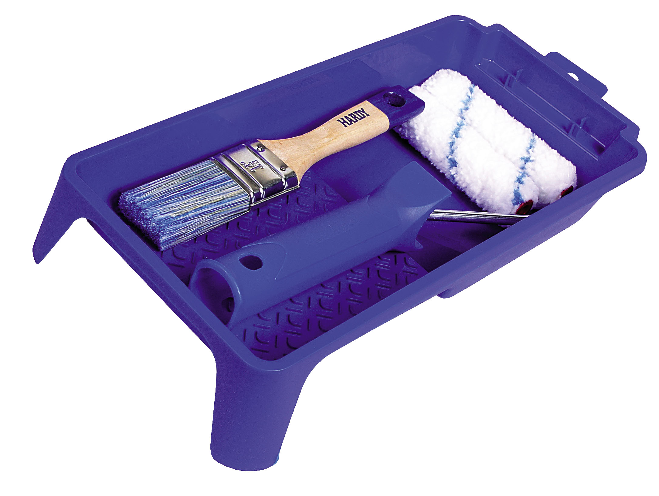 Zestaw malarski wyposażony jest w ładną i praktyczna kuwetę wykonaną z trwałego tworzywa sztucznego, pędzel malarski z dobrej jakości włosiem oraz walec do pokrywania dużych powierzchni.